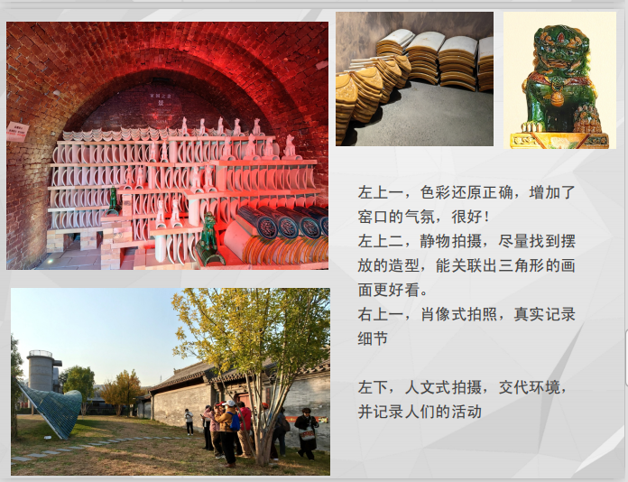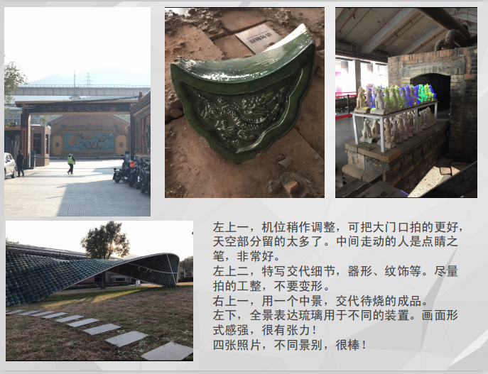 本期外拍紧扣学员学习进度与地域文化特色,旨在引导学员以镜头记录琉璃艺术的独特魅力。课堂上,指导老师王燕君围绕“带着思考按快门”展开现场教学,从琉璃瓦浓郁色彩的真实还原,到老厂房光影层次的历史表达,引导学员用镜头述说摄影“语言”