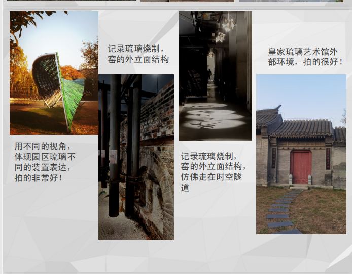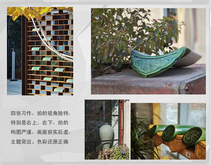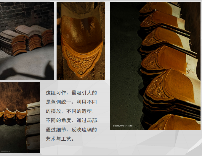 学员们积极尝试不同机位与视角,运用光圈调整、虚实对比等手法,让一片残瓦、一角厂房焕发全新的视觉韵味。在这场与琉璃的“光影对话”中,大家不仅锻炼了拍摄技能,更深刻感受到琉璃文化在厚重历史与鲜活当下交融中所展现的包容与生命力。