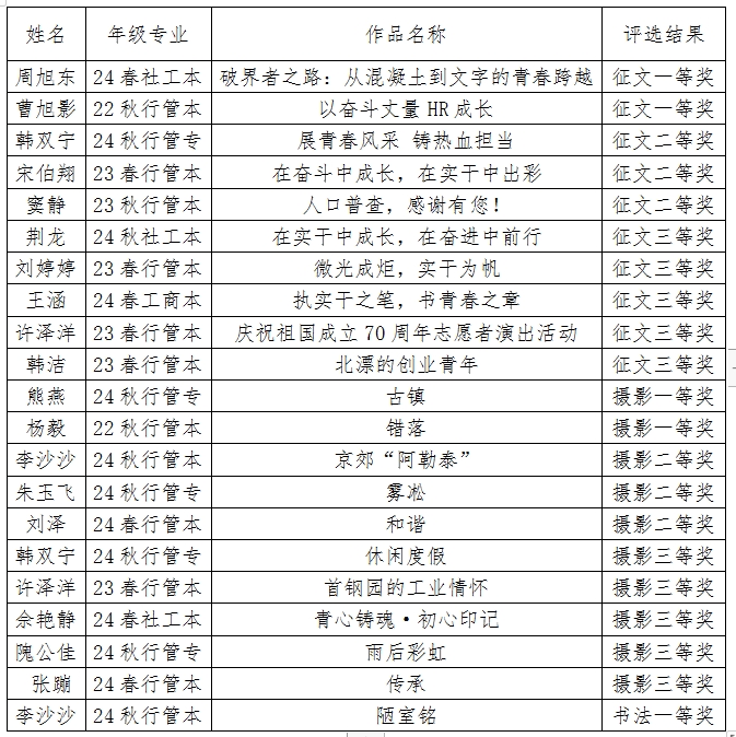 经过专家评审,一批优秀作品和才华横溢的学员脱颖而出!征文、摄影、书法三大类共评选出一等奖5名、二等奖6名、三等奖10名。让我们为这些闪闪发光的同学鼓掌!